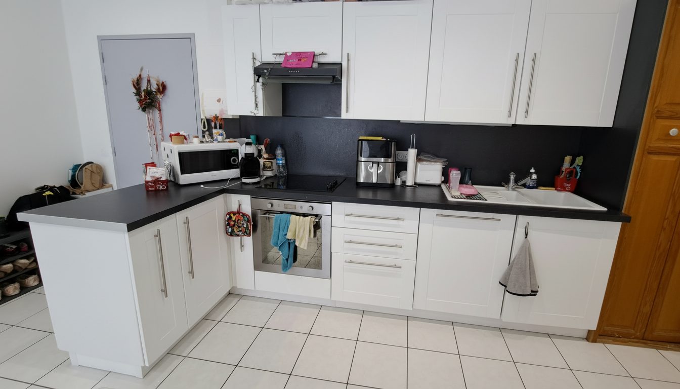 Distribution: Grande pièce de vie avec cuisine aménagée et équipée, dégagement avec placard, WC indépendant, salle d’eau avec espace buanderie et 2 grandes chambres de 11 et 13 m².
